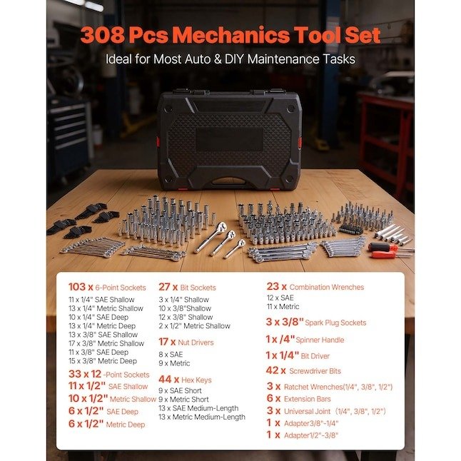 Upgrade your toolkit with this all-in-one 308-piece mechanics tool set, designed for both professionals and DIY enthusiasts. Featuring a full range of sockets, wrenches, screwdriver bits, and accessories, this comprehensive kit is perfect for automotive repair, home maintenance, plumbing, and general projects. Built from durable CR-V steel and organized in a sturdy storage case, it delivers performance, convenience, and long-lasting reliability.